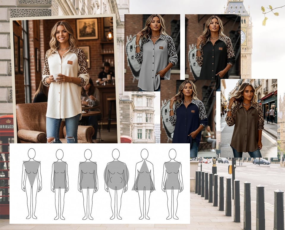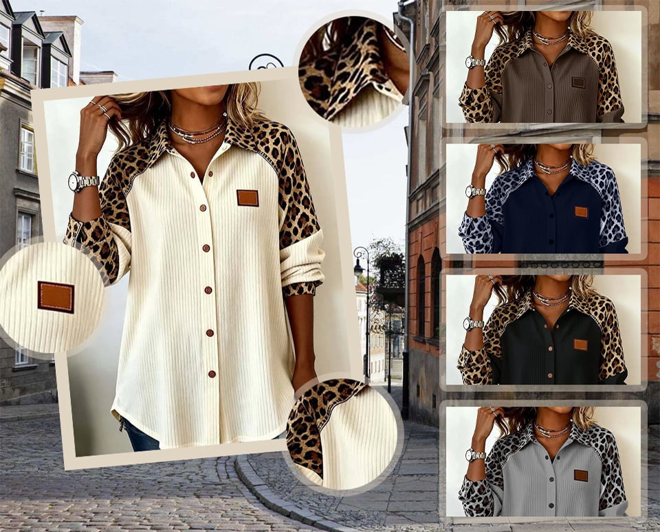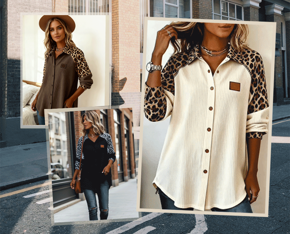Klassisk skjortsilhuett möter djärva leoparddetaljer — mjuk, enkel och full av attityd.